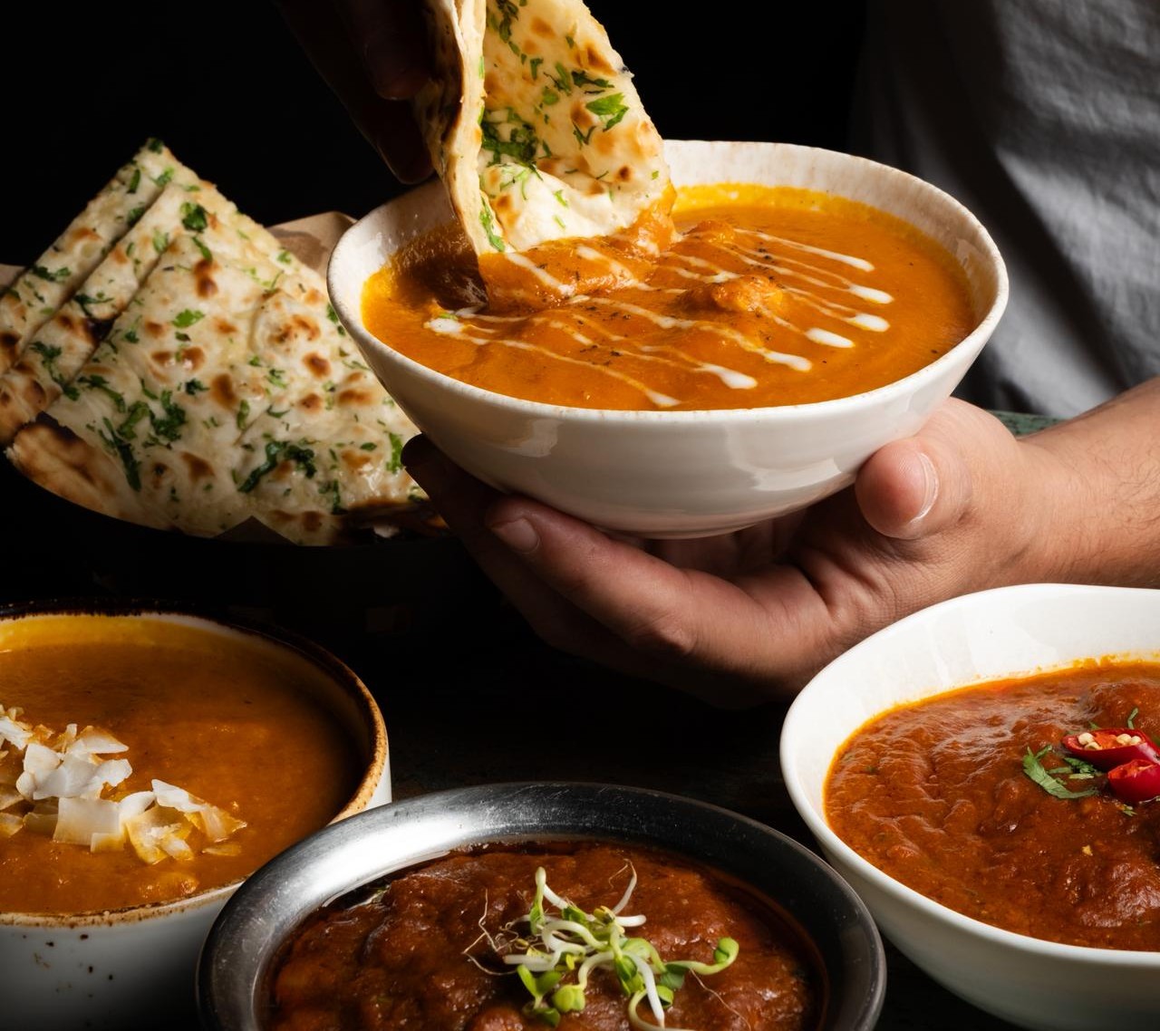 La cocina del Punjab destaca por su carácter intenso, sus ricos currys y sus célebres especialidades al tandoor. Desde el inconfundible Butter Chicken hasta el crujiente Bhindi Fry y el aromático Lacha Parantha, cada plato es una celebración de texturas y sabores.